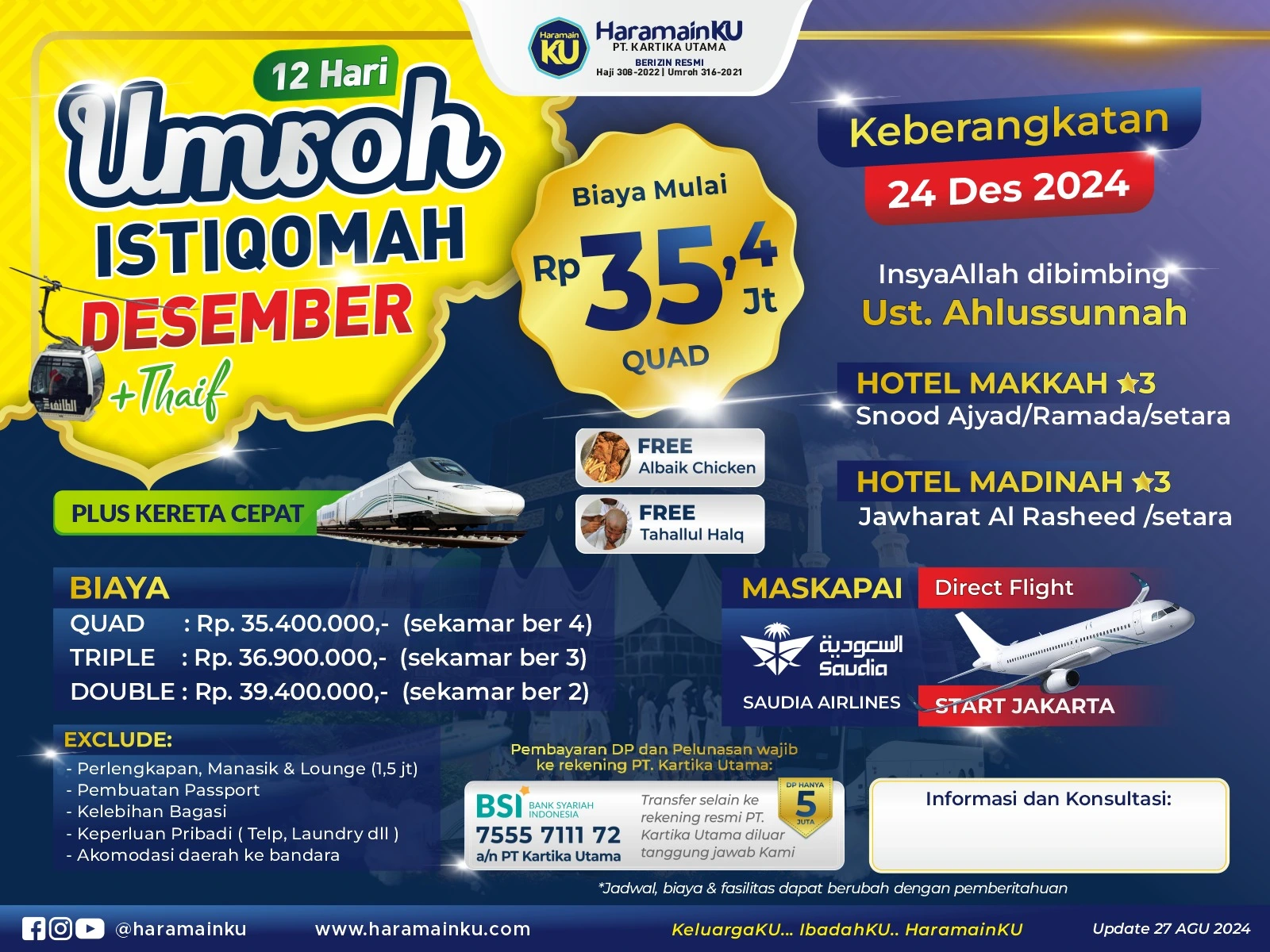 Fasilitas yang disediakan disesuaikan dengan kebutuhan jamaah. HaramainKu dapat menyediakan pendampingan harian atau hanya layanan bantuan selama ibadah umroh sesuai permintaan.